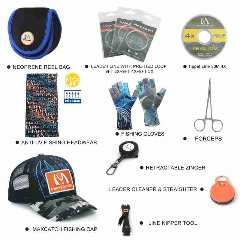Accessories, BOX & ROD BAG – A durable but also convenient travel rod bag with reel pouch to hold everything together. 10 pc hand tied lures packed in a waterproof box. A neoprene reel pouch is included for easy protection of the reel. Also included are the most used tools for anglers including forceps, line cleaner, line nipper with retractor, and fishing cap, anti-uv fishing headwear.