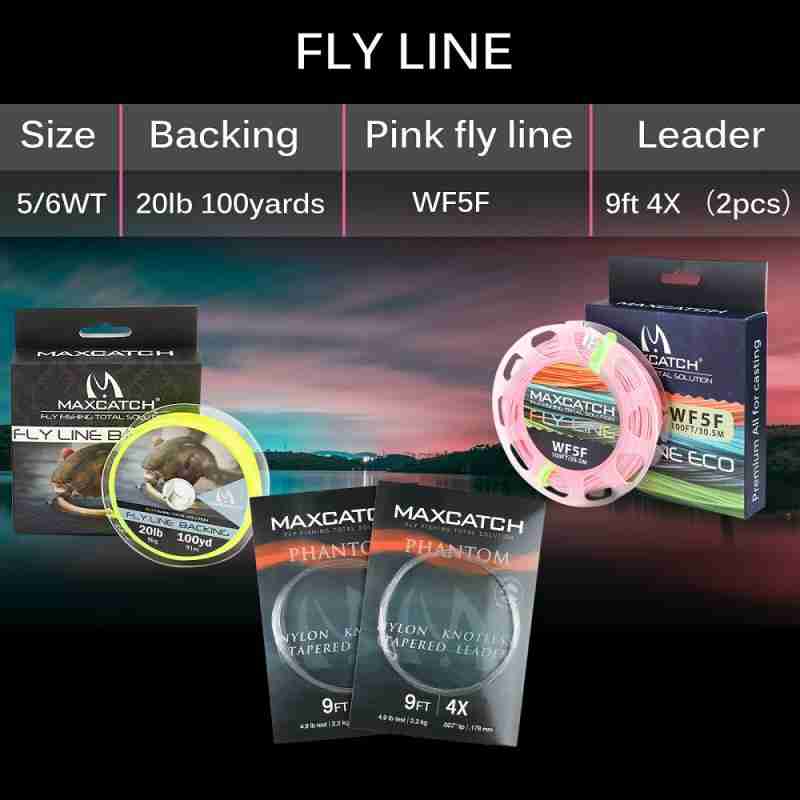 -WF5F pink fly line, 2pcs 9′ 4x tapered leaders, 20 lb 100 yard yellow backing (note that the reel and line are separated)