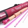 -Elegant pink 9′ 5-weight, 4-piece fly rod made of IM6 graphite with an A-grade cork grip, solid machined aluminum reel seat, and pink cordura rod tube