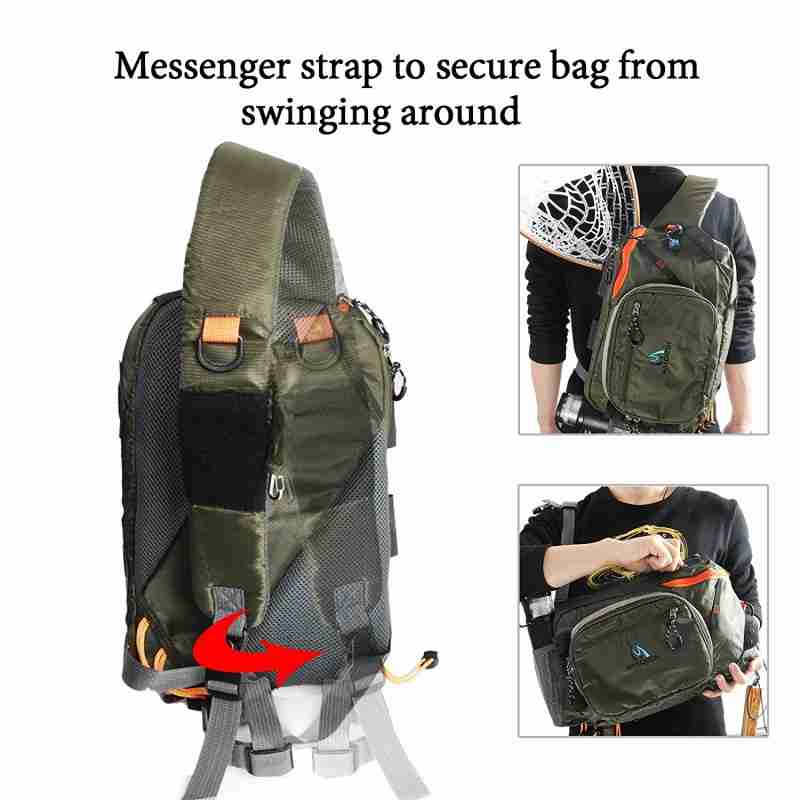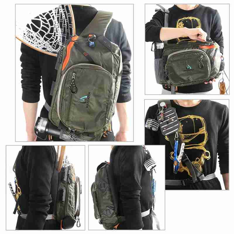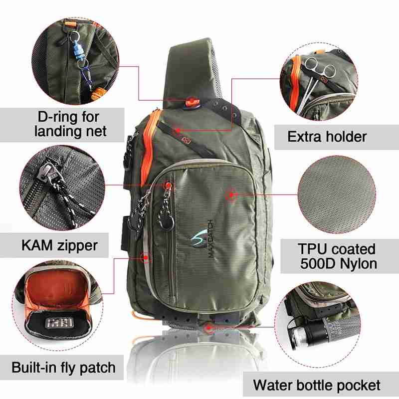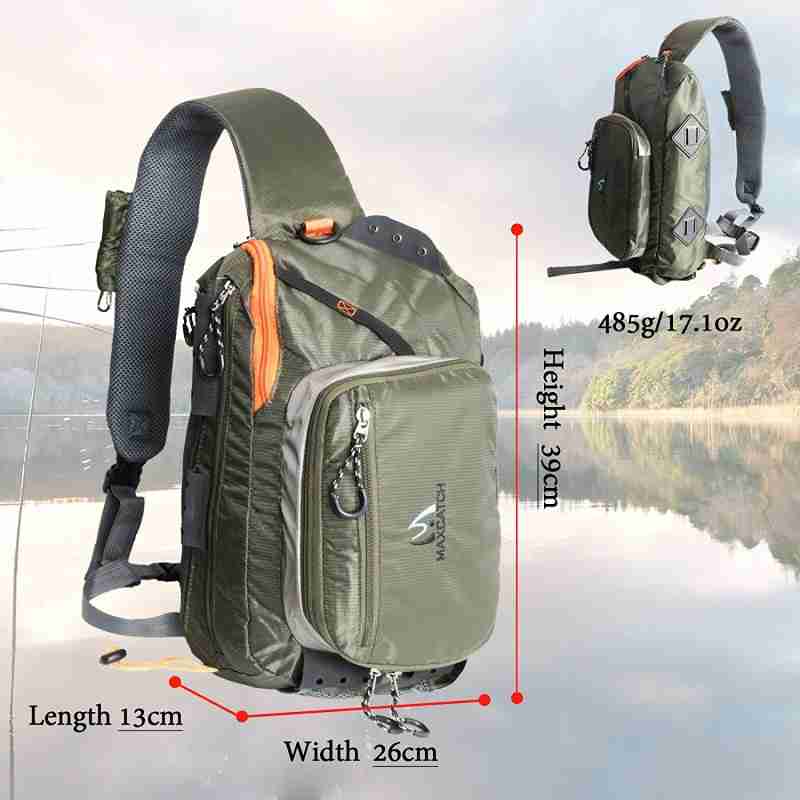 • Maxcatch Fly Fishing Sling Bag High Capacity with Patch– Weight : 16oz / 470g     — Design allows quick access to the zippered compartments — Nylon waist strap What our sling pack provides is shoulder and hip support to carry all your fishing gears and ease of access.By spinning the bag around to your side and drawing the top-facing zipper back, cavernous inner space is accessed.